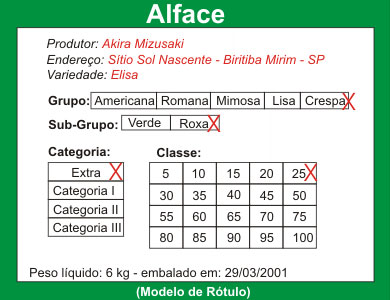 OBSERVAÇÕES: É tolerada uma mistura de 10% de pés de alface de classe diferente da especificada no rótulo, desde que pertencentes às classes imediatamente superior e/ou inferior. São toleradas 20% das embalagens do lote que estejam fora das especificações acima.
